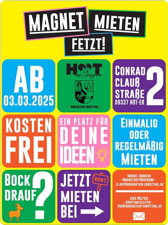 Eine wesentliche Schlüsselimmobilie im Stadtzentrum ist das ehemalige Kaufhaus "Magnet". Die Ladenfläche im Erdgeschoss war zuletzt bis Ende 2019 an die "Pfennig-Insel" vermietet. Seit der Anmietung durch die Stadtverwaltung ab Februar wurden die Räumlichkeiten zeitweise bei innerstädtischen Veranstaltungen, z.B. Frühlingsfest (Modenschau), Hohensteiner Jahrmarkt (Präsentation Tomaten-Queen) bzw. Weihnachtsmarkt (Modellbahnausstellung) genutzt. Ab 1. Mai 2024 erfolgt die Untervermietung zwecks Nutzung als Automatenladen. Betreiberin ist Frau Kleine, Inhaberin von Parkers und Berries in Wüstenbrand. Der Untermietvertrag sah aber auch vor, dass ein Teil der Fläche weiterhin bei städtischen Veranstaltungen genutzt werden kann. Zwischenzeitlich war aber vermehrt Vandalismus in den Räumlichkeiten zu verzeichnen, der eine wirtschaftliche Weiterbetreibung als Automatenladen nicht mehr zulässt. Daher wurde der Untermietvertrag gekündigt. Bis Ende August 2025 (Ende des Förderzeitraums) soll weiterhin eine Nutzung bei städtischen und Vereins-Veranstaltungen ermöglicht werden (siehe Flyer "MAGNET mieten").