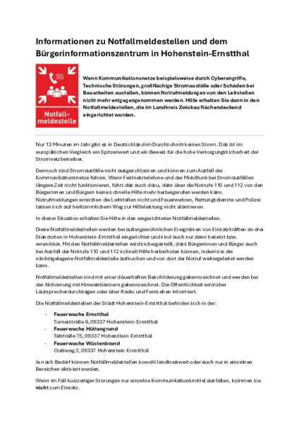 Informationen zu Notfallmeldestellen und dem Bürgerinformationszentrum in Hohenstein-Ernstthal