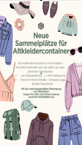 Hier ein Hinweis unseres Amtes und Bürgerservice zu den neuen Standorten der Altkleidercontainer.