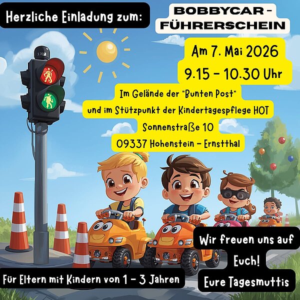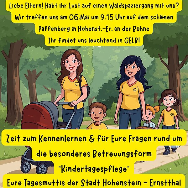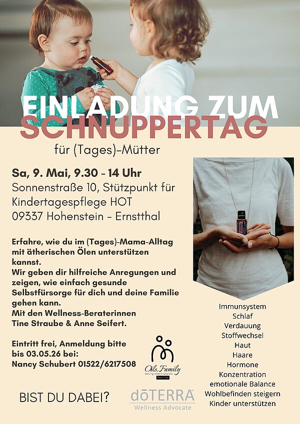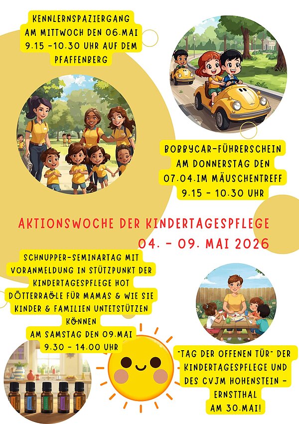 Im Rahmen der Aktionswoche der Kindertagespflege in Sachsen vom 4. bis 9. Mai 2026 laden Tagesmütter aus Hohenstein-Ernstthal zu verschiedenen Kennenlernangeboten für Eltern mit kleinen Kindern ein. Die Veranstaltungen bieten Gelegenheit, die Betreuungsform Kindertagespflege näher kennenzulernen und mit regionalen Tagespflegepersonen ins Gespräch zu kommen.