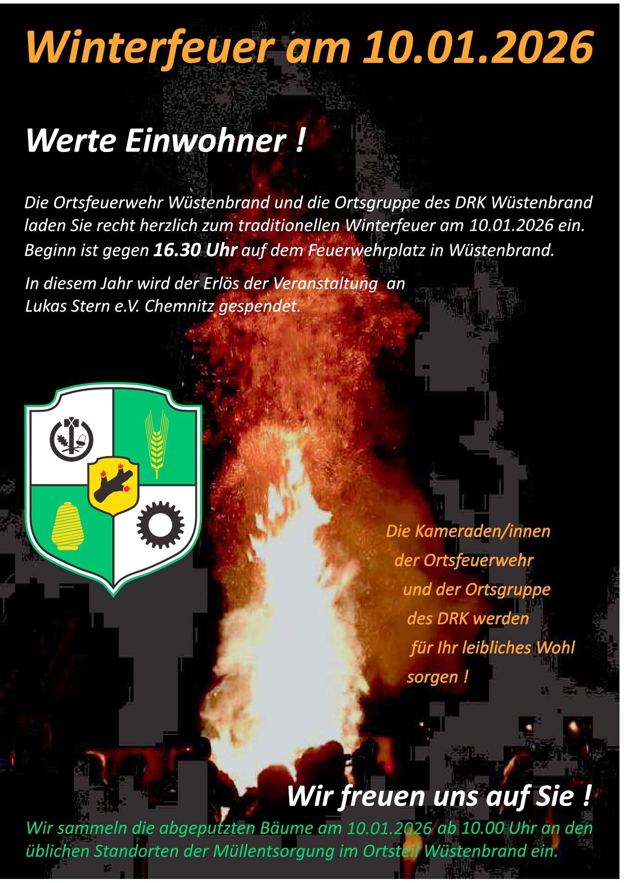 Die abgeputzten Bäume werden am 10.01.2026, ab 10:00 Uhr an den üblichen Standorten der Müllentsorgung im Ortsteil eingesammelt.