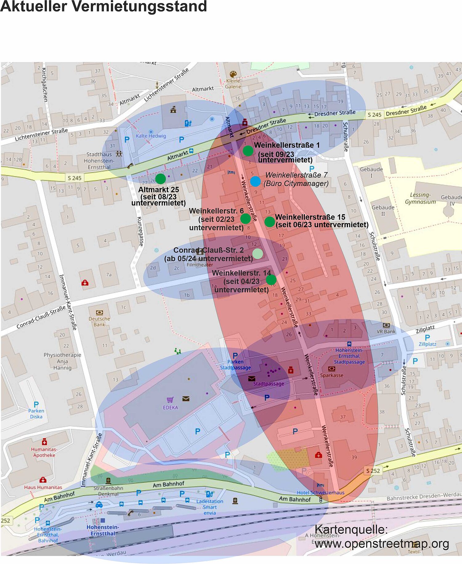 Dafür wurden insgesamt 6 Mietverträge mit den jeweiligen Eigentümern bislang leerstehender Ladenräume im Fördergebiet abgeschlossen. Somit wurde die lt. Zuwendungsantrag vorgesehene Anzahl an Anmietungen erreicht. Es handelt sich um die Objekte Altmarkt 25, Conrad-Clauß-Straße 2, Weinkellerstraße 1, Weinkellerstraße 6, Weinkellerstraße 14 und Weinkellerstraße 15, die als Läden auf Zeit an interessierte Nutzer zur befristeten Untervermietung mit variablen Mietzeiten (bis max. 2 Jahre) zur Erprobung ihrer Geschäftsideen zur Verfügung standen: