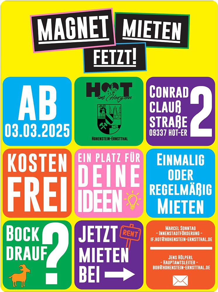 Eine wesentliche Schlüsselimmobilie im Stadtzentrum ist das ehemalige Kaufhaus "Magnet". Die Ladenfläche im Erdgeschoss war zuletzt bis Ende 2019 an die "Pfennig-Insel" vermietet. Seit der Anmietung durch die Stadtverwaltung ab Februar 2023 wurden die Räumlichkeiten zeitweise bei innerstädtischen Veranstaltungen, z.B. Frühlingsfest (Modenschau), Hohensteiner Jahrmarkt (Präsentation Tomaten-Queen) bzw. Weihnachtsmarkt (Modellbahnausstellung) genutzt. Ab 1. Mai 2024 erfolgt die Untervermietung zwecks Nutzung als Automatenladen. Betreiberin war Frau Kleine, Inhaberin von Parkers und Berries in Wüstenbrand. Der Untermietvertrag sah aber auch vor, dass ein Teil der Fläche weiterhin bei städtischen Veranstaltungen genutzt werden kann. Zwischenzeitlich war aber vermehrt Vandalismus in den Räumlichkeiten zu verzeichnen, der eine wirtschaftliche Weiterbetreibung als Automatenladen nicht mehr zuließ. Daher wurde der Untermietvertrag im gegenseitigen Einvernehmen beendet. Bis November 2025 (Ende des Förderzeitraums) gab es weiterhin eine Nutzung bei städtischen und Vereins-Veranstaltungen (siehe Flyer "MAGNET mieten").