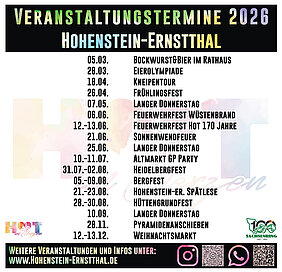 Wir bitten um Mitteilung aller geplanten, öffentlichen Veranstaltungen in Hohenstein-Ernstthal für das Jahr 2026 mit genauer Bezeichnung der Veranstaltung mit Datum, Zeit, Ort und ggf. entsprechendem Bildmaterial, welches auch im Internet und den sozialen Kanälen veröffentlicht werden darf.